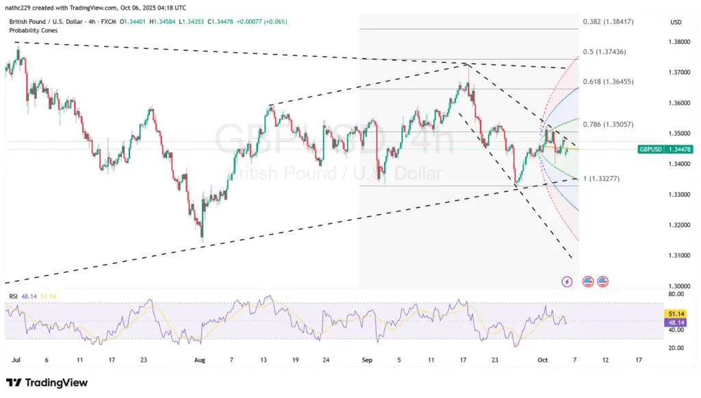 - Bearish Scenario: Failure to defend 1.3430–1.3418 would shift momentum lower, exposing 1.3360, then 1.3324 (September trend low).